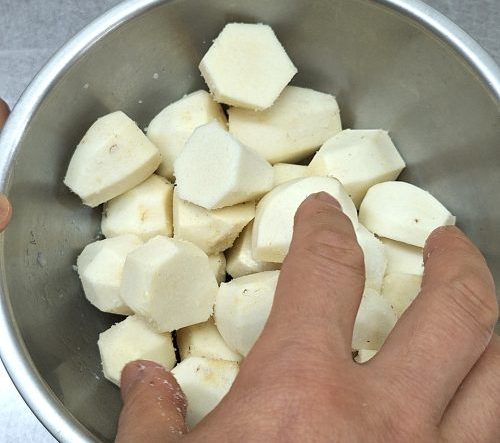 里芋は上下を切って縦にきっぱりと皮をむいてから塩もみして粘りを出やすくします。