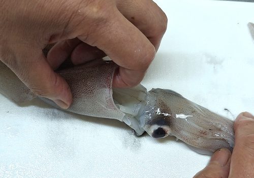 いかは頭と胴に分け、頭の方は目の下で切って内臓を除き、流水で吸盤をこすり洗いして除きます。