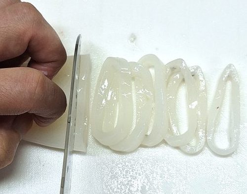 胴の方は軟骨を抜いてえんぺらを外し、皮をむいてから輪切りにします。