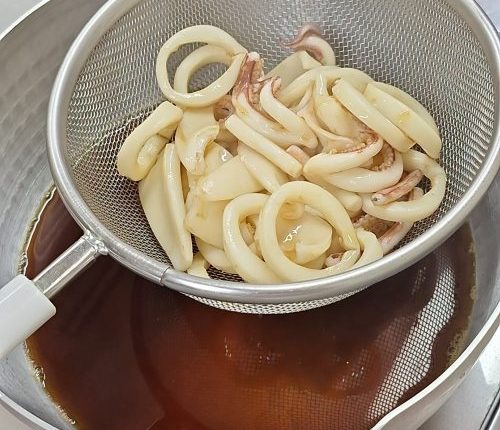 いかは長く煮るとかたくなるので色が変わったら、ざるにあけていかと煮汁に分けます。