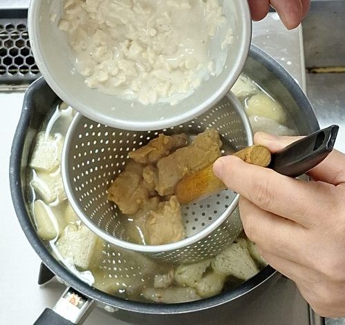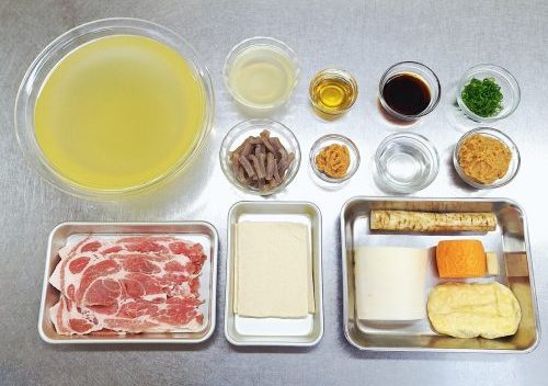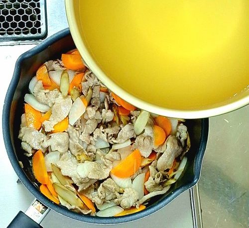 まず最初に豚肉を炒めて脂が出てきたら、根菜も加えて炒めてから出汁を注ぎます。