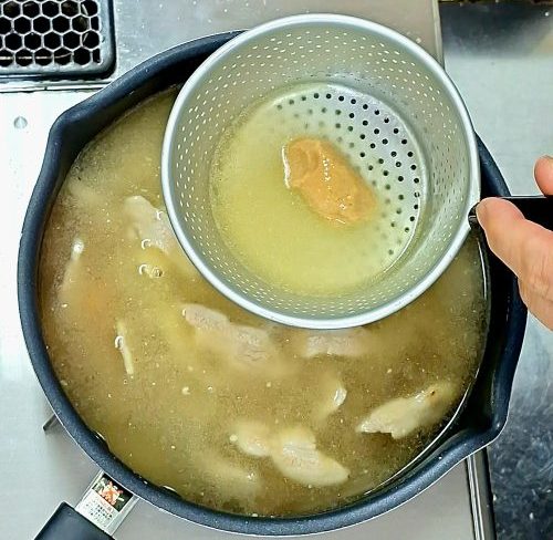 取り立てのお出汁が熱いうちに少量の出汁で酒粕はゆるめておくと後で加えるときに溶けやすくなります。